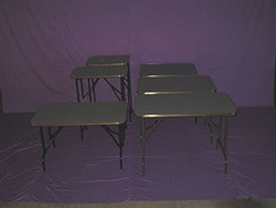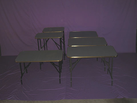 Tables are wooden tops bolted to metal legs, secure, mottled black/grey color, top surface for good footing & edged in attractive gold trim.